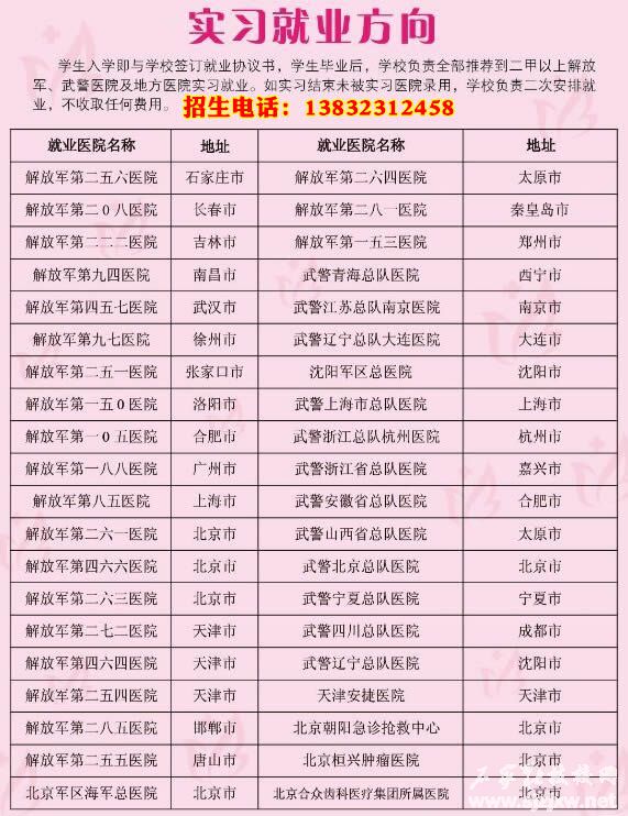 入学签订就业协议,学生毕业后,学校负责全部推荐到石家庄、北京、天津、太原、邯郸、唐山、秦皇岛、沈阳、大连、长春、郑州、武汉、南昌、嘉兴、合肥、西安、兰州、成都、上海、杭州、无锡、徐州、广州等解放军、武警及地方医院实习就业。实习结束未被医院录用,学校负责二次安排就业,不收取任何费用。